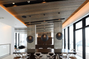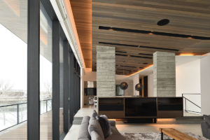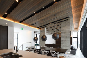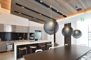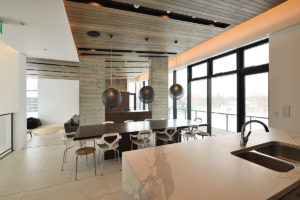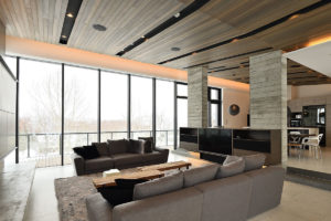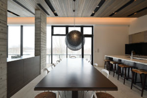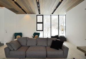 With high ceilings, contemporary gas fireplace feature, comfy facing sofa, and a dining table with views out to the magical scenery the living and dining space at Jun merely are stunning. The white floors and uncluttered design create light and space that gives the upper-level room a trendy look.