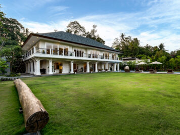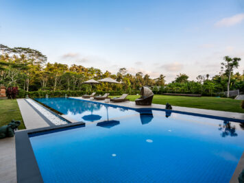 Product Description: Villa Agung, the crown jewel of The Pala—Ubud’s most prestigious luxury estate—captivates from the very first moment. A pair of ornately carved wooden gates opens to reveal a tranquil courtyard framed by manicured lawns and a stone pathway that guides you toward the home’s striking single-pavilion design. The grand entrance, adorned with traditional gold, green, and red detailing, immediately evokes a sense of elegance, artistry, and deep cultural connection.