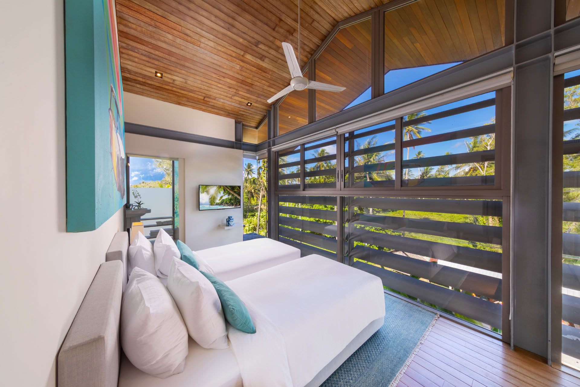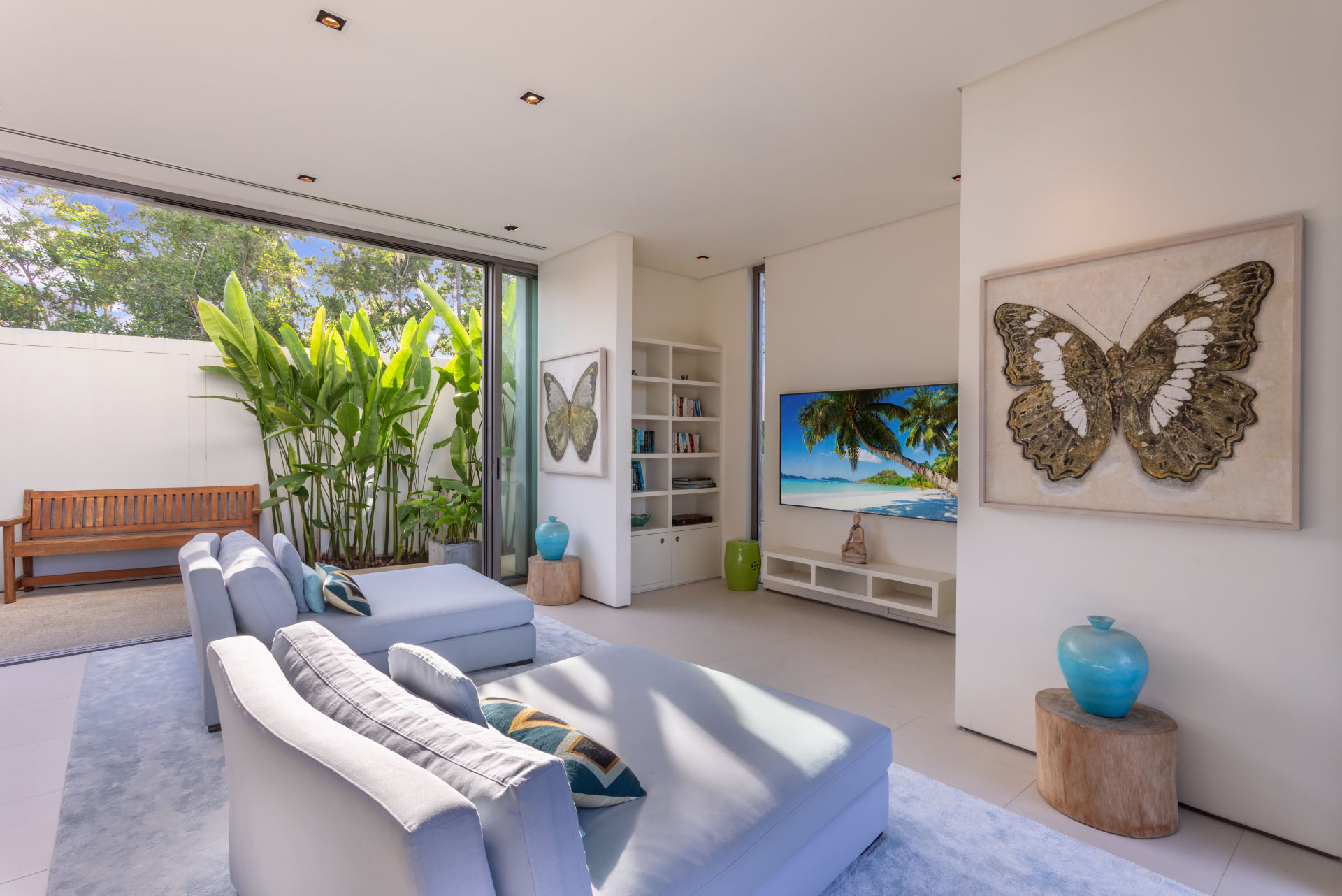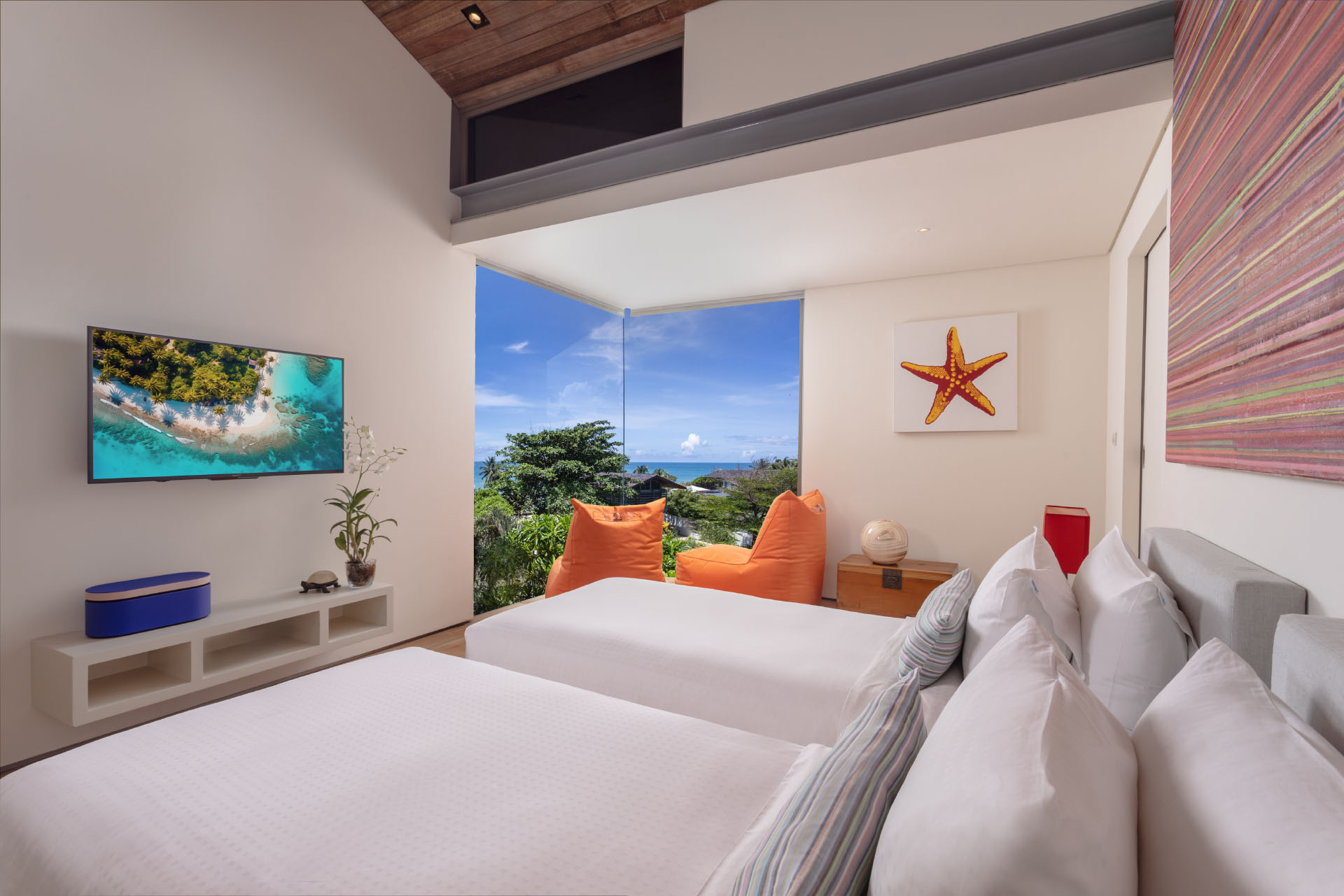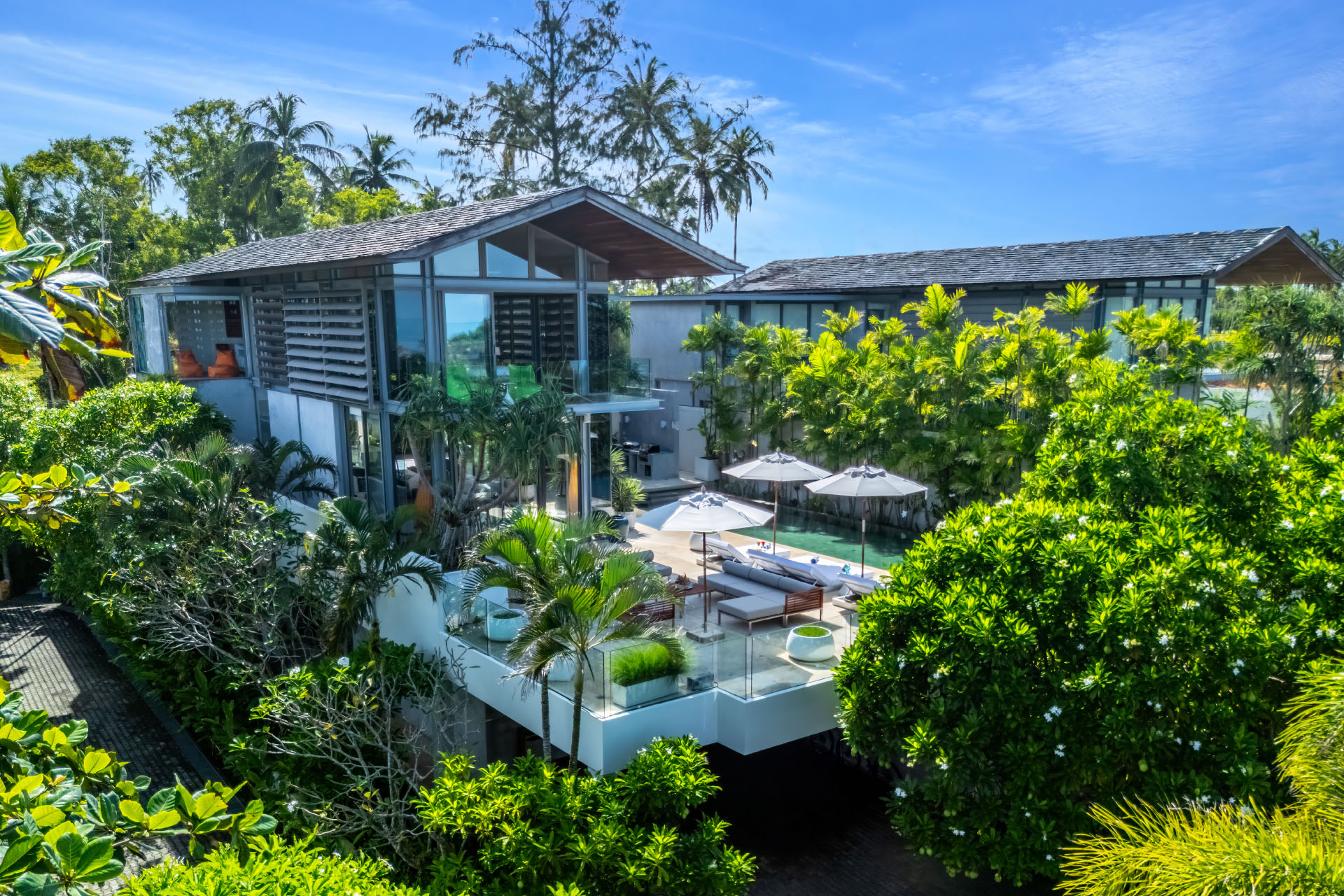 The villa’s open-plan design invites the outdoors in, with floor-to-ceiling glass panels framing panoramic views of the Andaman Sea and filling the interiors with natural light. Two king-bedded master suites and two versatile twin bedrooms are thoughtfully appointed, each designed with a minimalist aesthetic that promotes rest and relaxation. Spacious communal areas—including an elegant living and media room, an inviting outdoor lounge, a well-equipped guest kitchen, and a sun-kissed pool deck—create an effortless flow between indoor comfort and alfresco living.