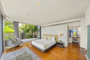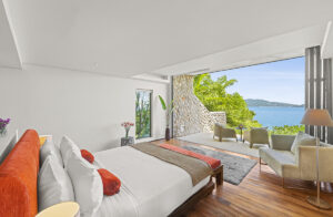Master Bedroom (50 m2)- King size bed; Ocean, sunset, and garden views; Terrace with 2 chairs; Walk-in closet; One couch; BOSE speaker; Safety box; Air conditioning; Ensuite bathroom with Rain shower, Double vanities, and Toilet; Toiletries; Hair dryer; Bathrobes; Slippers; Umbrellas