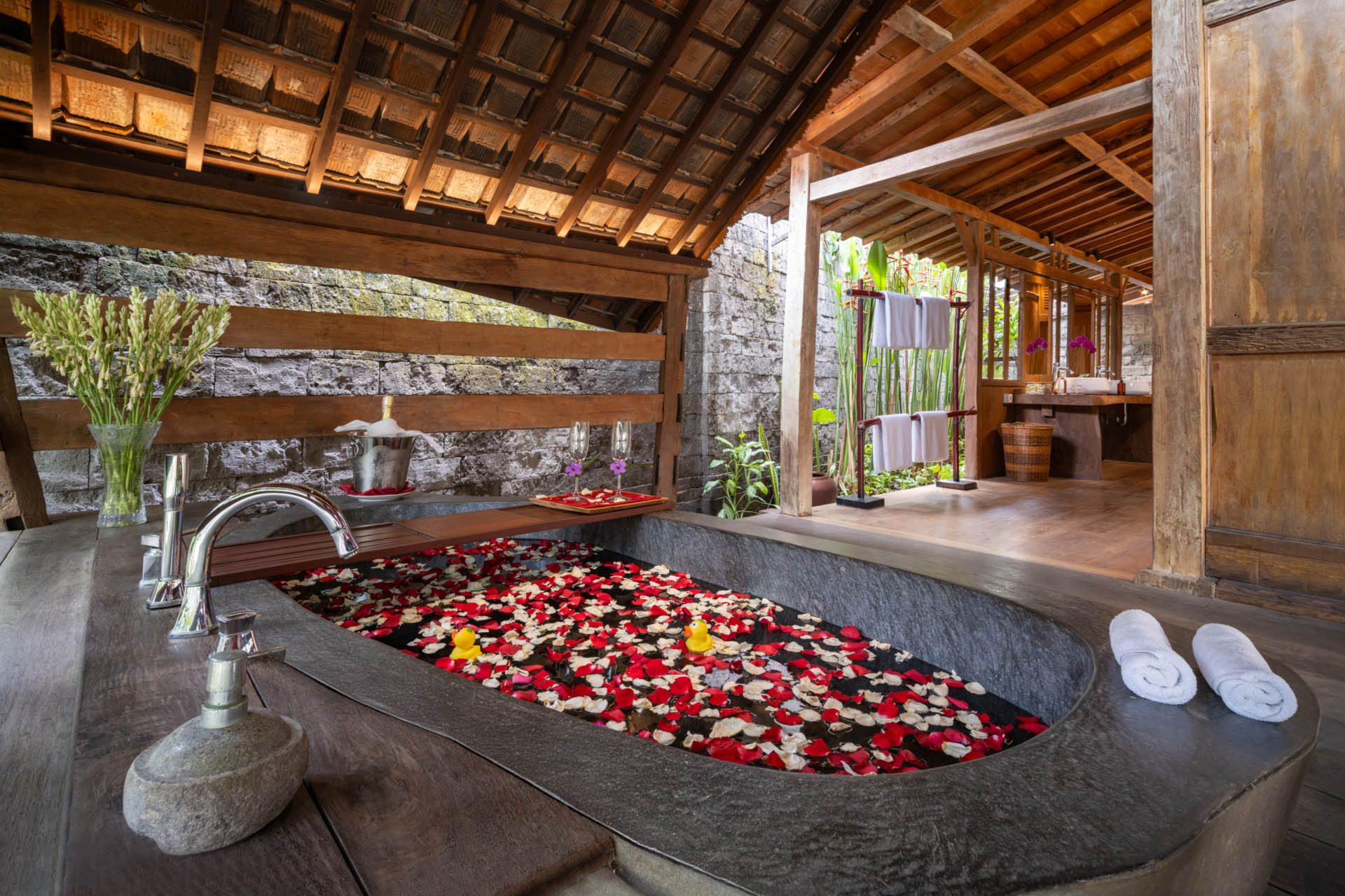 Gobyok Room 1 – Garden view; 1 King size bed; Flatscreen TV; Wardrobe; Dressing table; Desk; Daybed; Air-conditioning; Ceiling fan; Wardrobe; Safety deposit box; Ensuite outdoor bathroom with bathtub, shower, double vanity and toilet; Toiletries; Hairdryer; Towel