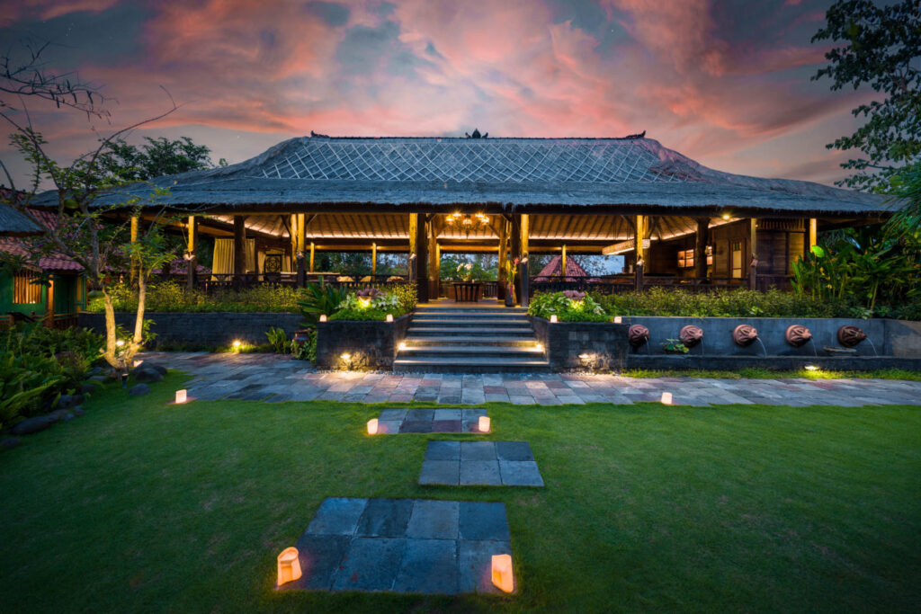 Limasan Room 1 – Garden view; Balcony with coffee table and lounge chair; 1 King size bed; Smart TV; Dressing table; Study table; Air-conditioning; Ceiling fan; Wardrobe; Safety deposit box; Ensuite outdoor bathroom with bathtub, shower, double vanity and toilet; Toiletries; Hairdryer; Towel
