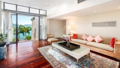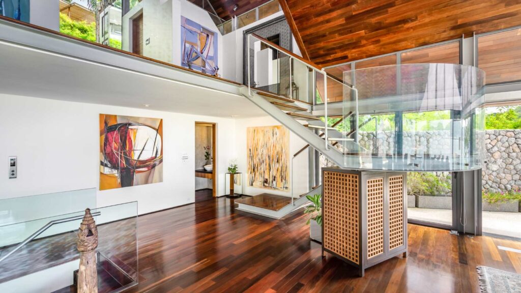 Warm tropical tones set the ambiance inside, with polished wooden floors, high ceilings, and tall glass folding doors that invite natural light and sea breezes throughout. The interiors are thoughtfully accented with handpicked modern art, rich textiles, and cultural artifacts that reflect a refined yet relaxed coastal aesthetic.