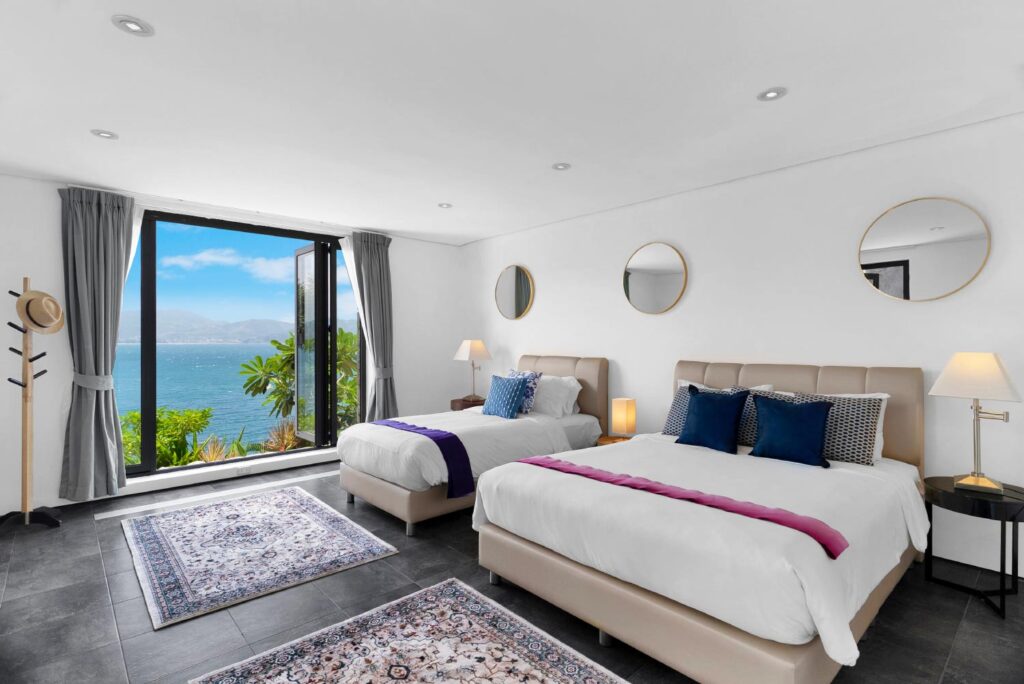 Guest Bedroom 5 (20 m2) –Queen size bed; Sea, sunset, and garden view; Private balcony; Closet; Air-conditioning; Safety box; Separate bathroom shared with Guest Bedroom 4 – bathtub & shower, double vanities, and toilet; Toiletries; Hairdryer; Slippers; Bathrobes; Umbrellas