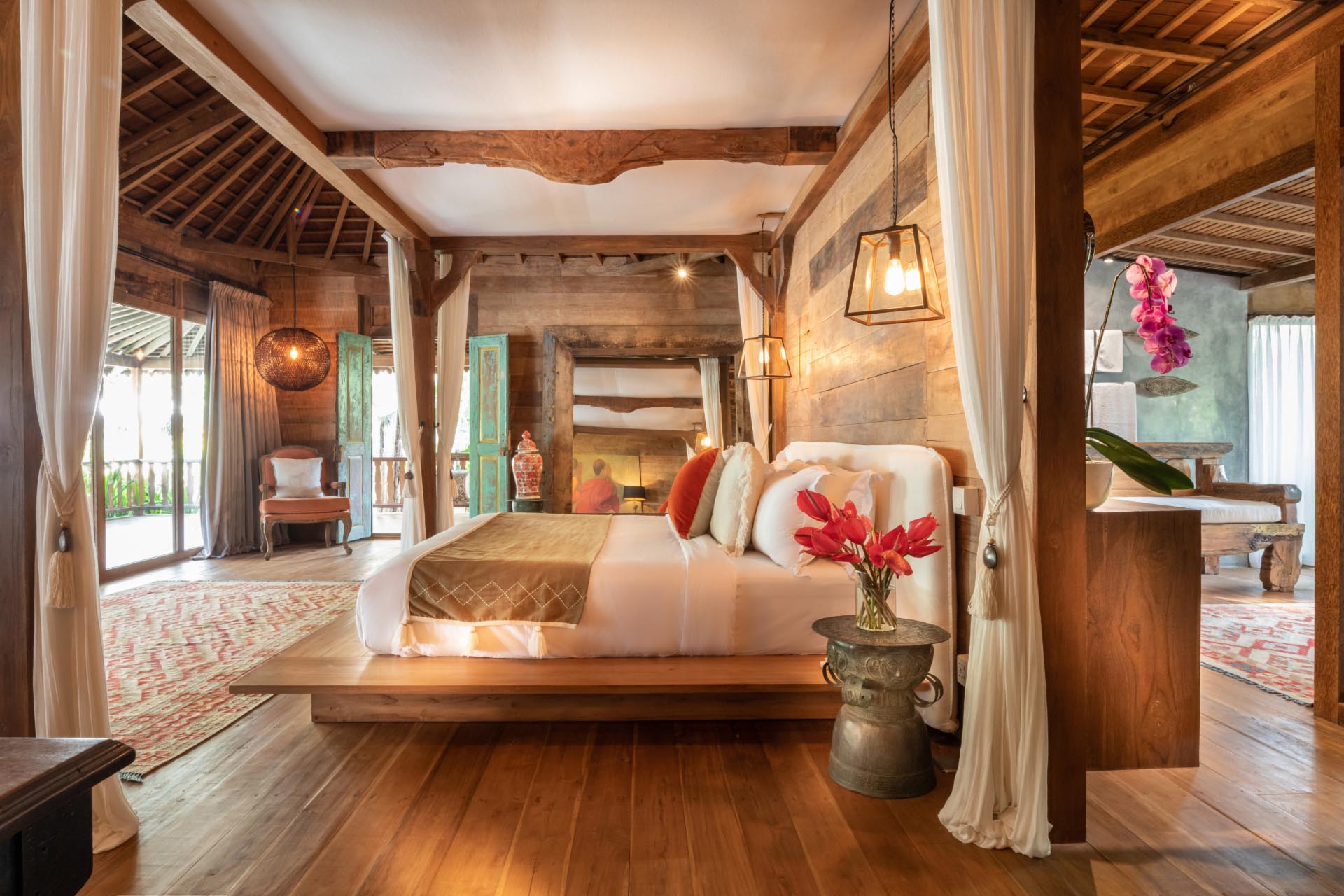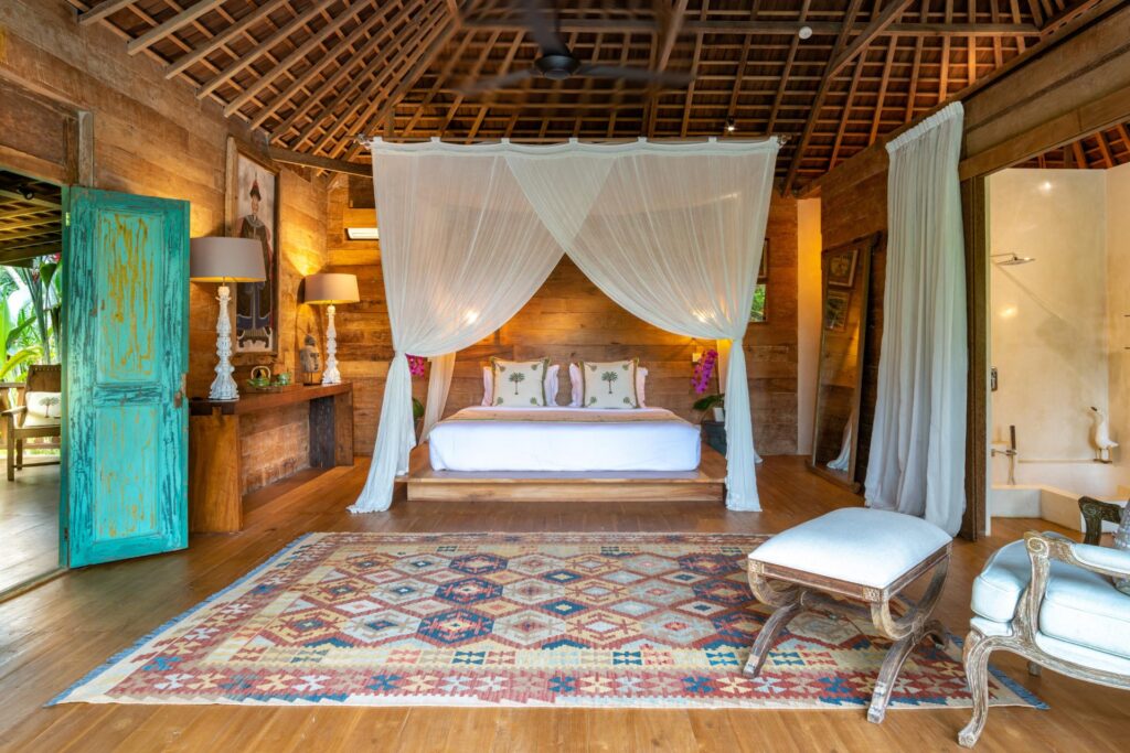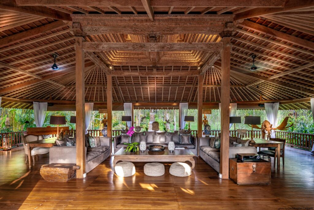 The estate offers eight beautifully designed ensuite bedrooms, each with a king bed and peaceful garden or pool views. Private soaking tubs and rain showers invite quiet moments of personal retreat. Accommodations include a stand-alone master suite, three secluded pool cottages, and four traditional “Joglo” rooms — allowing families and groups to enjoy togetherness while still having their own private sanctuaries.