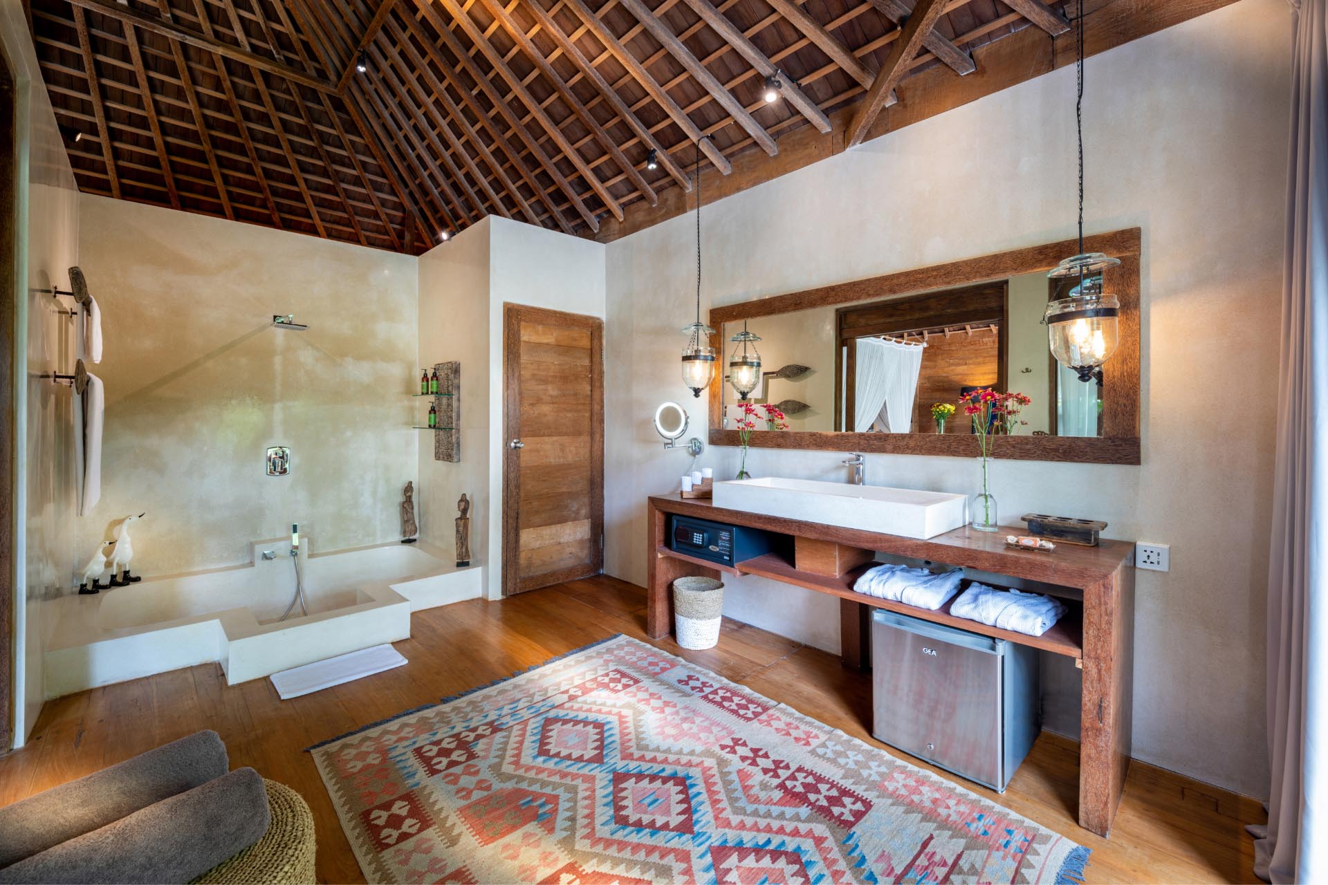 Joglo 4 – Balcony with pool and garden view; 1 King size bed; Minibar; Air-conditioning; Wardrobe cabinet; Ensuite bathroom with bathtub, shower, double vanity and toilet with bidet; Bathrobe; Toiletries; Hairdryer; Towel