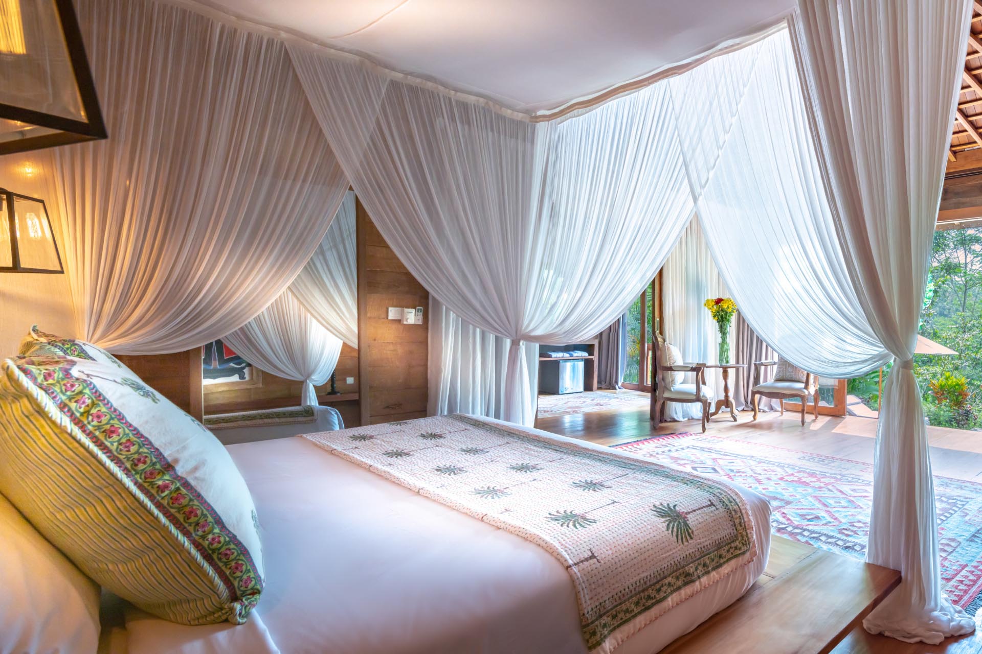 Joglo 1 – Balcony with pool and garden view; 1 King size bed; Daybed; Minibar; Air-conditioning; Wardrobe cabinet; Ensuite bathroom with bathtub, shower, double vanity and toilet with bidet; Bathrobe; Toiletries; Hairdryer; Towel