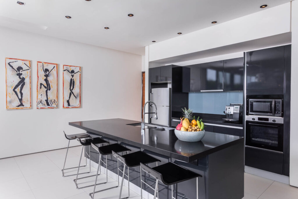 The accommodation includes two expansive master suites and five guest bedrooms, each featuring en-suite bathrooms and personalized touches such as sound systems, flat-screen TVs, and comfortable lounge spaces. Flexible layouts ensure comfort for all ages, with a choice of king, double, single, or bunk beds. Additional in-room amenities include balconies with seating, walk-in closets, his-and-hers wardrobes, bathtubs, bathrobes, mini libraries, and children’s toys—making the villa as versatile as it is luxurious.