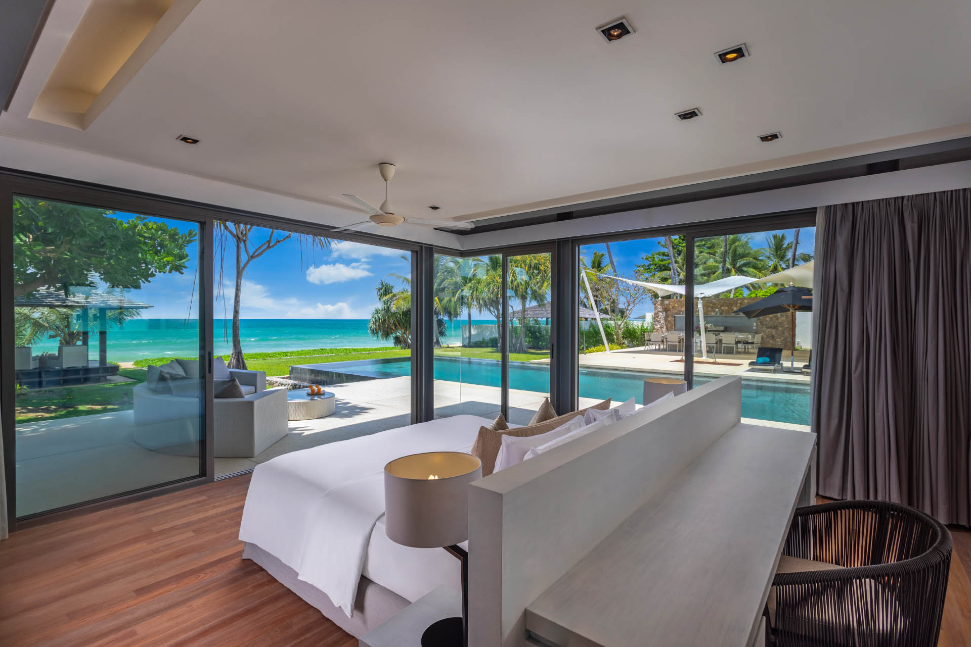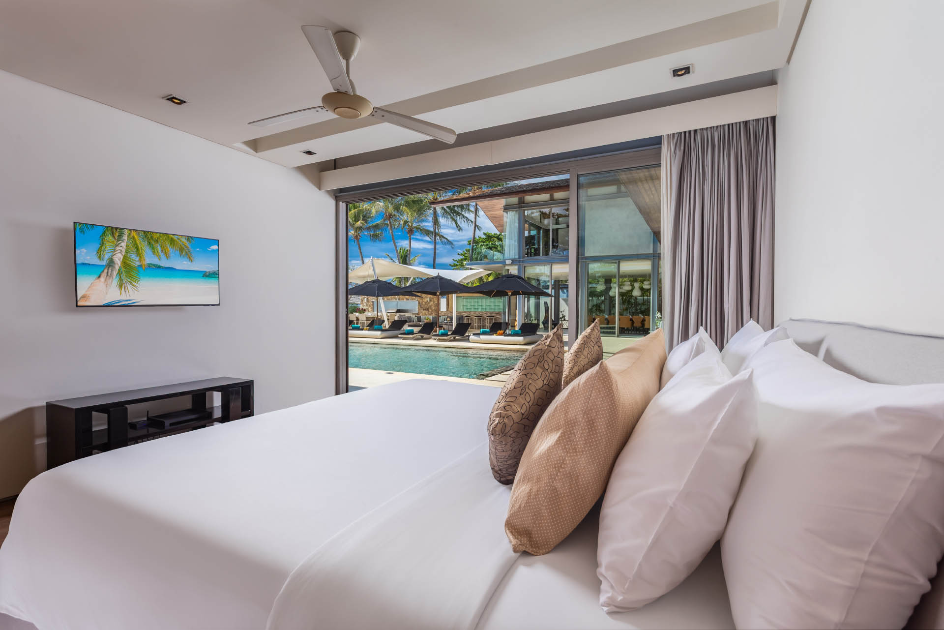 Master Bedroom 1 (68 m2) — King size bed; Ocean, swimming pool, and sunset views; Outside patio for 8 persons; Walk-in closet; Work desk; 42-inch flat screen TV with True Vision platinum package; Onkyo sound system; 3 seater couch; Safety box; Ceiling fan; Air conditioning; Ensuite bathroom with bathtub, rain shower, double vanities, and toilet; Toiletries; Hair dryer; Bathrobes; Slippers; Umbrellas