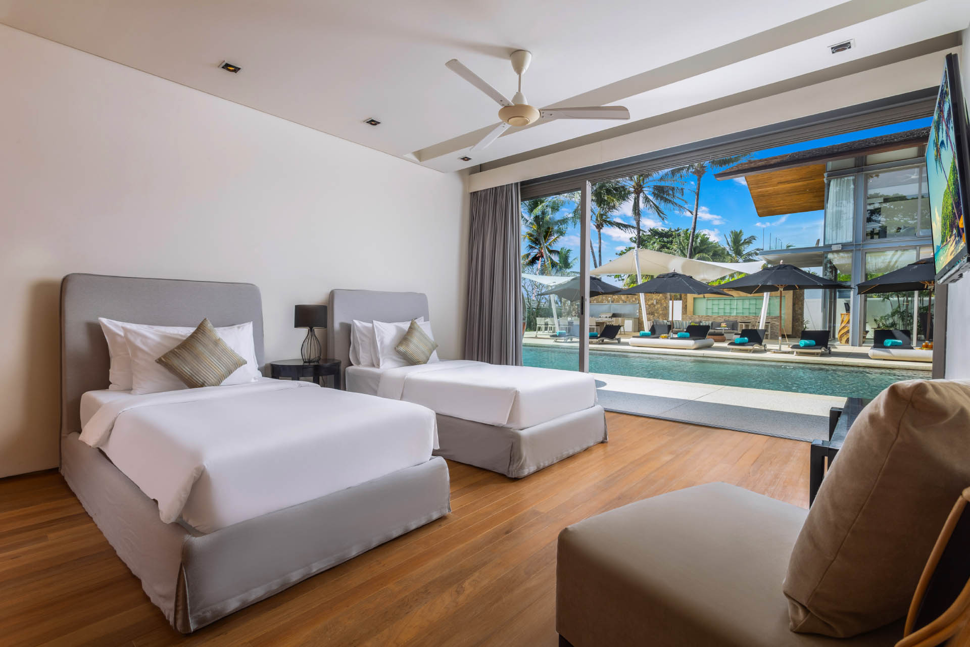 Guest Bedroom 2 (30 m2) — King size bed or 2 Single beds; Swimming pool view; Her & Him closet with a lock cupboard; 42-inch flat screen TV with True Vision platinum package; Ceiling fan; Air conditioning; Shared bathroom with bathtub, rain shower, double vanities, and toilet; Toiletries; Hair dryer; Bathrobes; Slippers; Umbrellas; Connecting to Bedroom 3