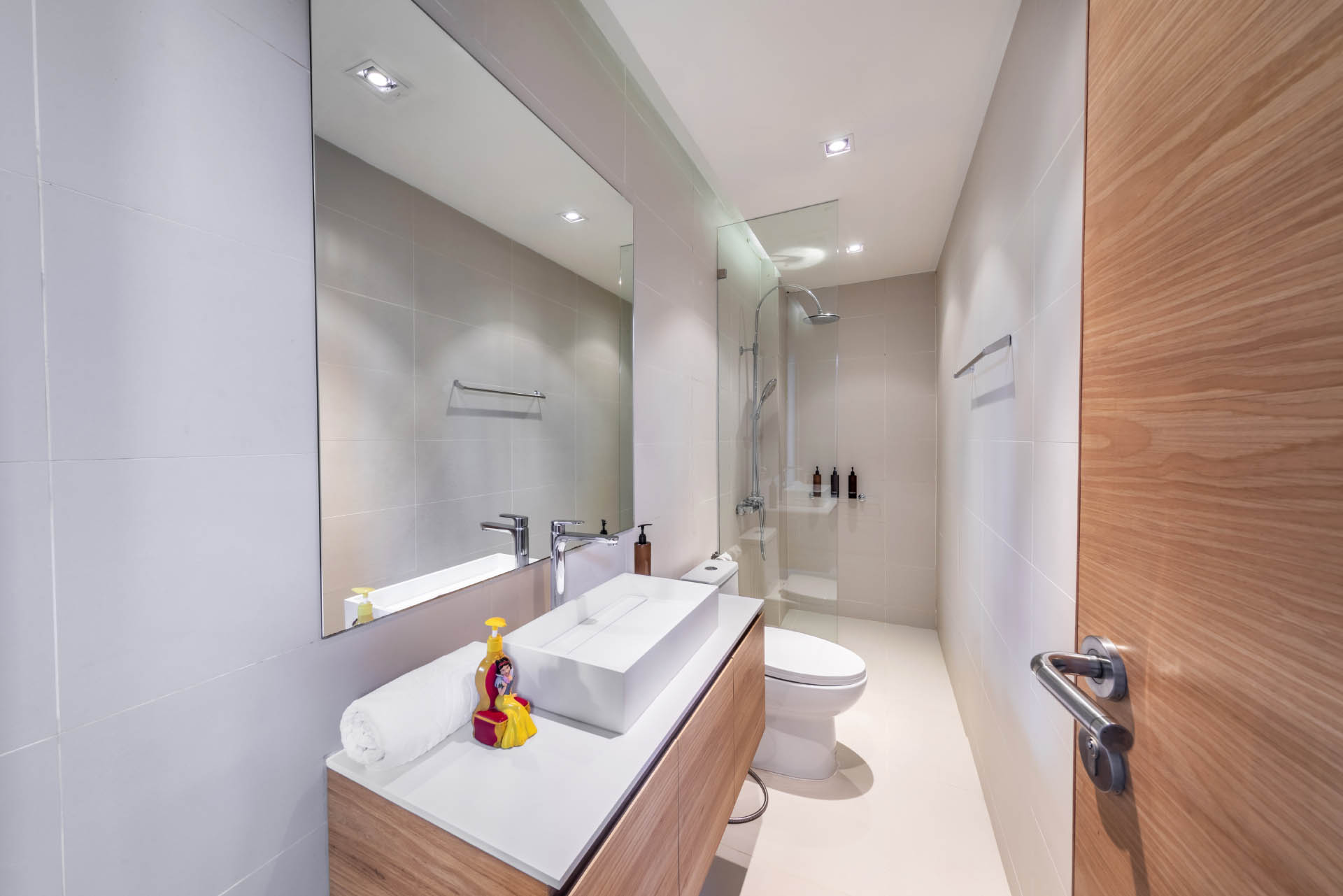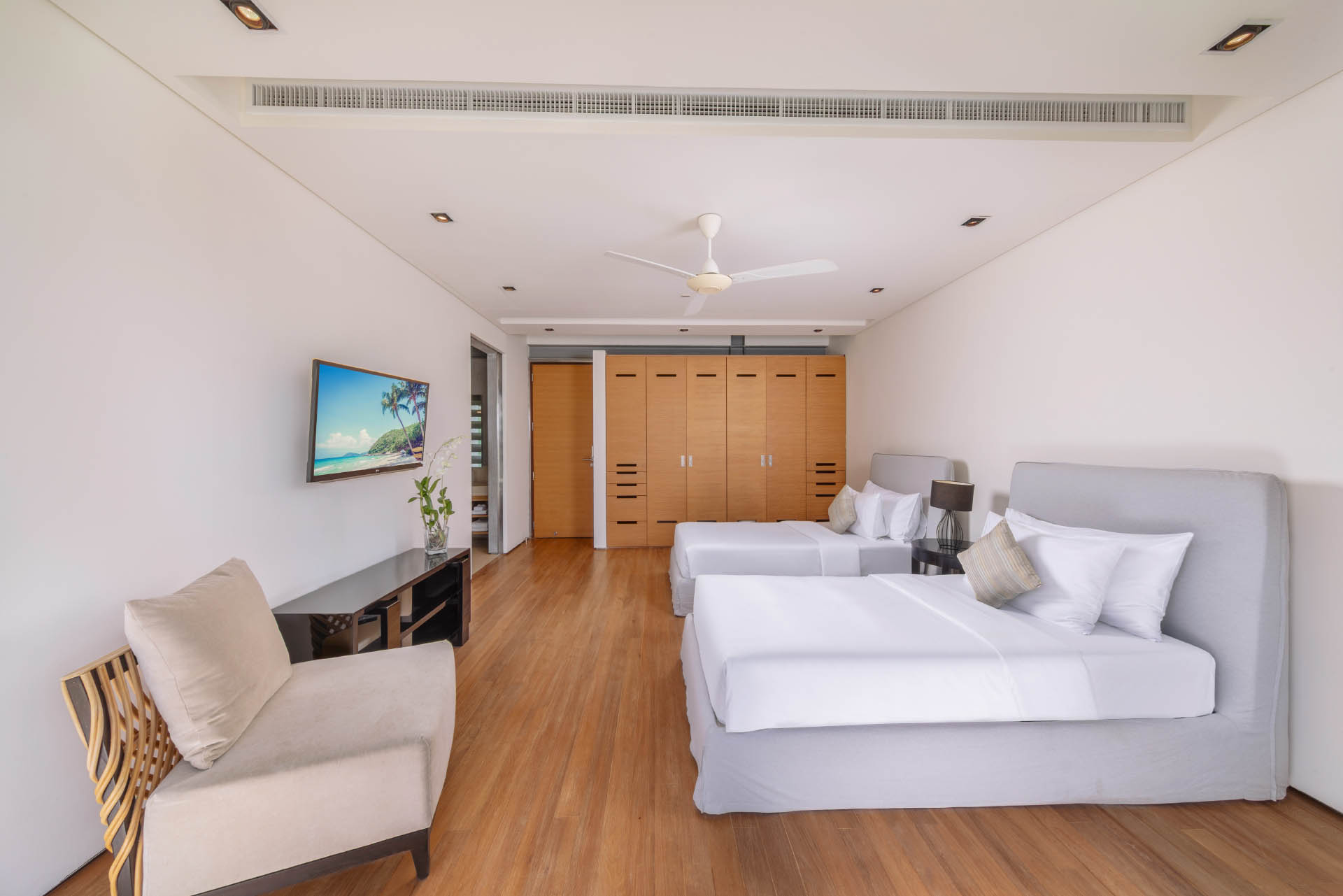 Guest Bedroom 5 (35 m2) — Double size bed & 1 Single bed; 42-inch flat screen TV with True Vision platinum package; Her & Him closet; Air conditioning; Ceiling fan; His and her closet; Ensuite bathroom with rain shower, vanity, and toilet; Toiletries; Hair dryer; Bathrobes; Slippers; Umbrellas