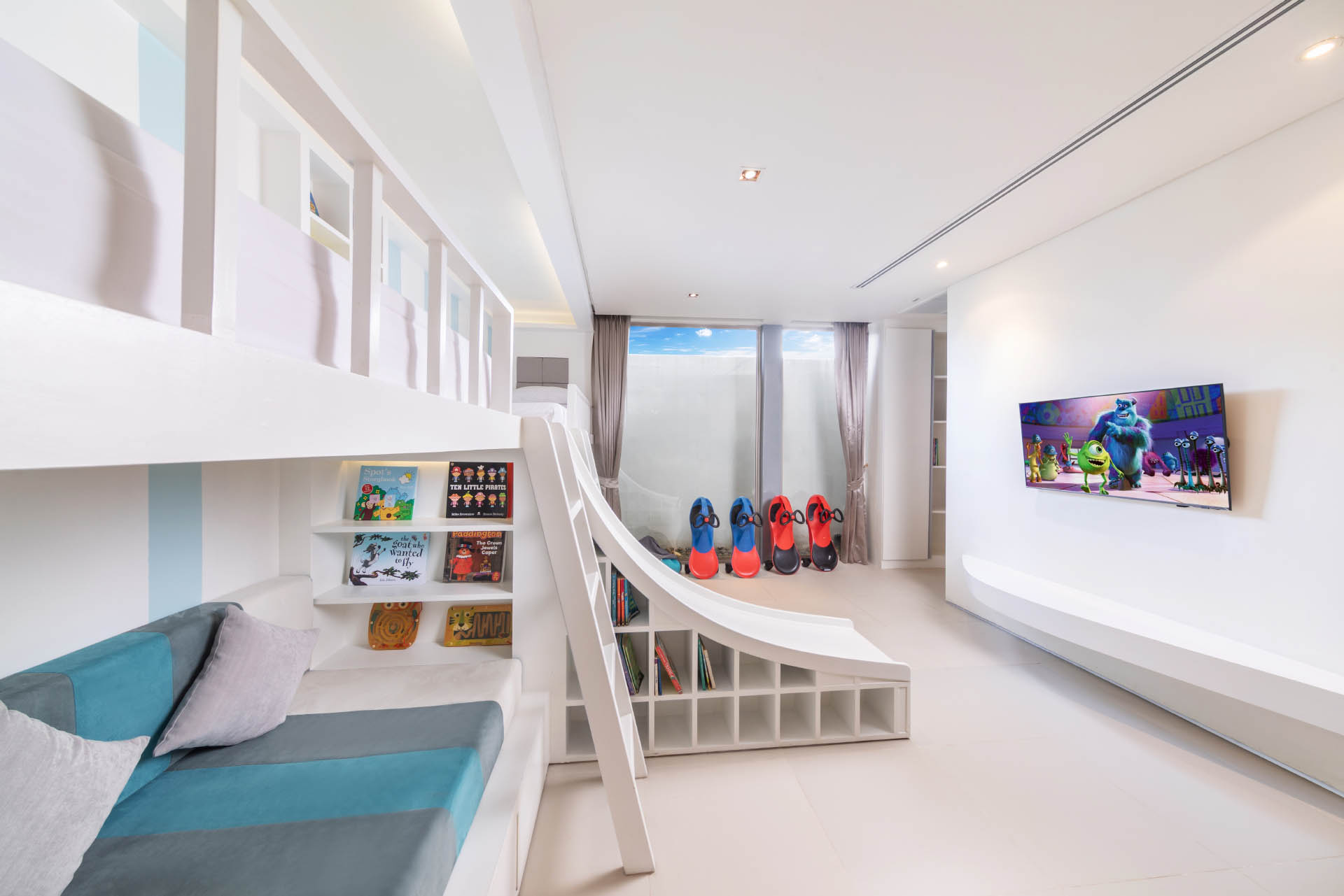 Kids’ Bedroom (18 m2) — 2 bunk beds with slide; 42-inch flat screen TV with True Vision platinum package; PS4 with 4 games; Mini library with books; Children’s toys; Air conditioning; Closet; Ensuite bathroom with shower, double child vanities, and toilet; Toiletries